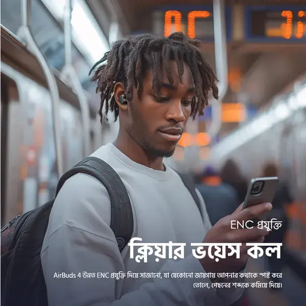 AirBuds 4 উন্নত ENC প্রযুক্তি দিয়ে সাজানো, যা যেকোনো জায়গায় আপনার কথাকে স্পষ্ট করে তোলে, পেছনের শব্দকে কমিয়ে দিয়ে।